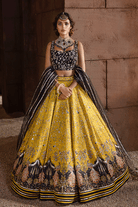 Delicately and carefully played on this outfit for modern mehndi brides of today. The black choli is made on net and viscos paired with printed Lehnga and net Dupatta. This outfit is hand crafted with silver and gold cut stones, sequences, Naqshi, Dabka and Pearls.