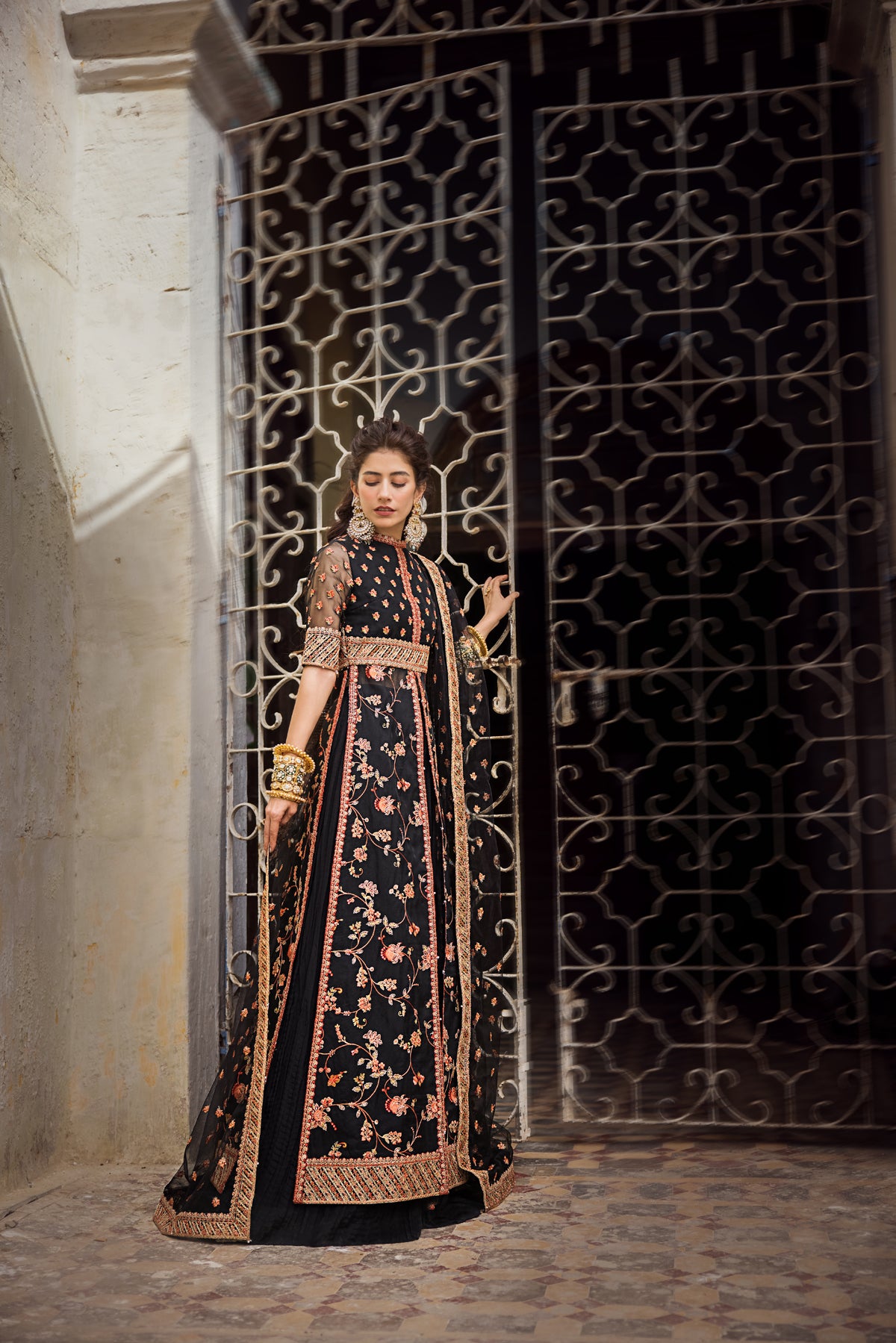 A black canvas tailored into a front slit open gown with elaborate floral embroidery all over and handworked borders and sleeves. It is paired with a flowy sharara and a sheer dupatta dusted with delicate coral motifs.