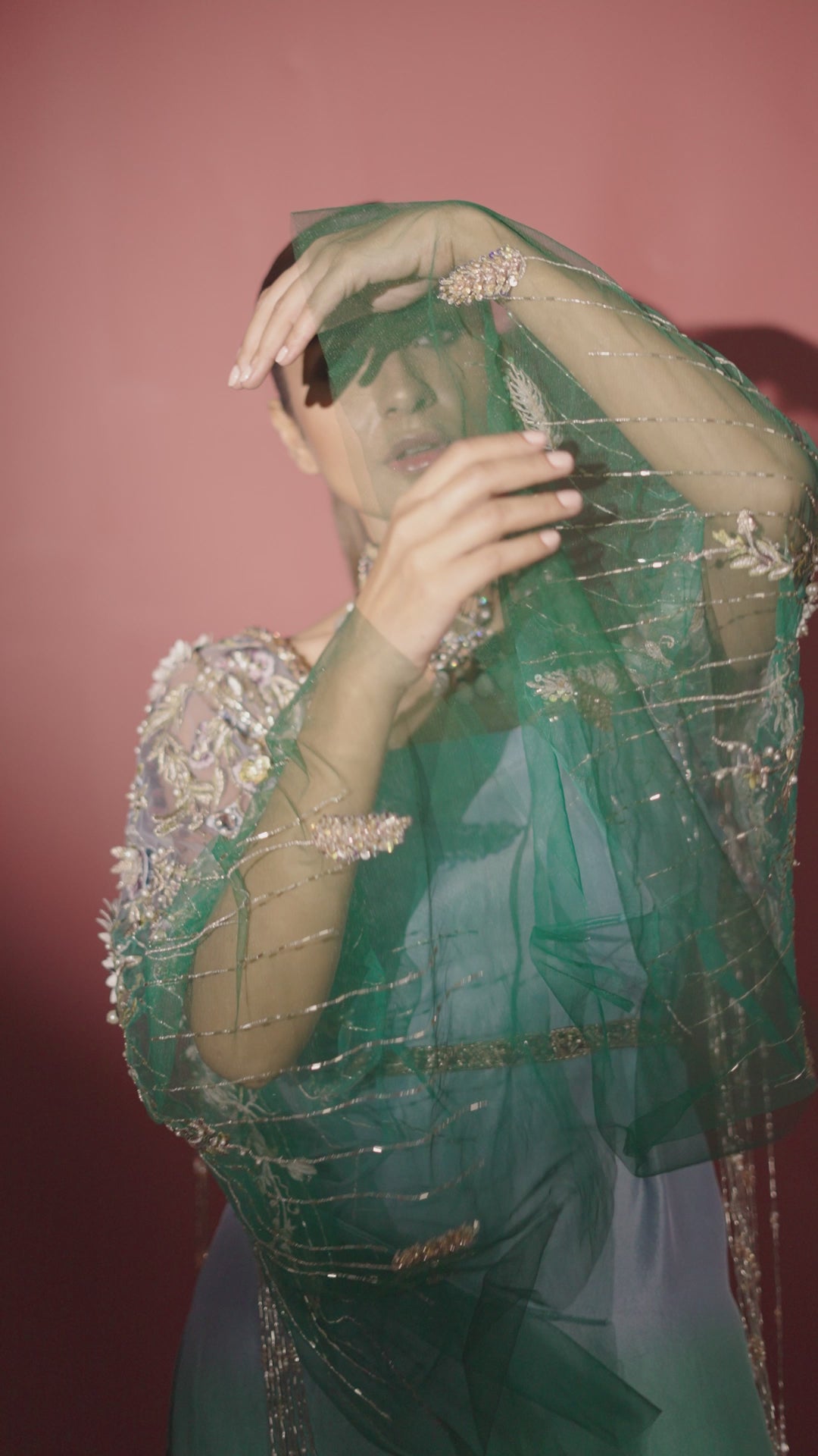 A never so seen gradient colour of Teal and blue. This two piece trouser shirt is made on pure raw silk fabric. The flared sleeves which is adding the right oomph in this dress is a breathtaking tassel effect on sleeves is giving the right royal feel.