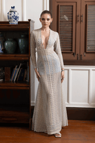 A delicate powder blue hue graces the soft, ethereal net, beautifully designed with a contemporary geometric pattern that exudes modern sophistication. Adorned with lustrous pearls, radiant crystals, and shimmering sequins, this masterpiece sparkles with understated elegance. Shaped into a romantic, flared silhouette, this enchanting creation is the perfect blend of femininity and modern artistry, leaving a lasting impression of effortless grace