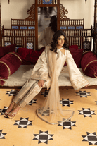 The ensemble is complemented by a delicate organza dupatta, adding airy grace and refined charm to the overall look. The harmony of texture and shine makes it perfect for Eid gatherings and evening festivities.