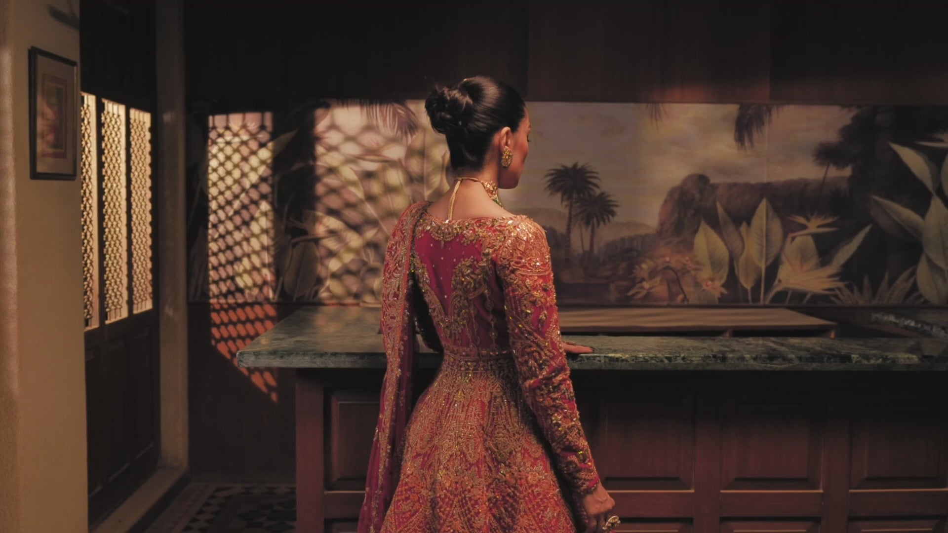 A majestic red color attire made with intricate embroidery and gotta work adorned with emerald green stones and crystal work followed by diverse sequins giving it all royal feels.