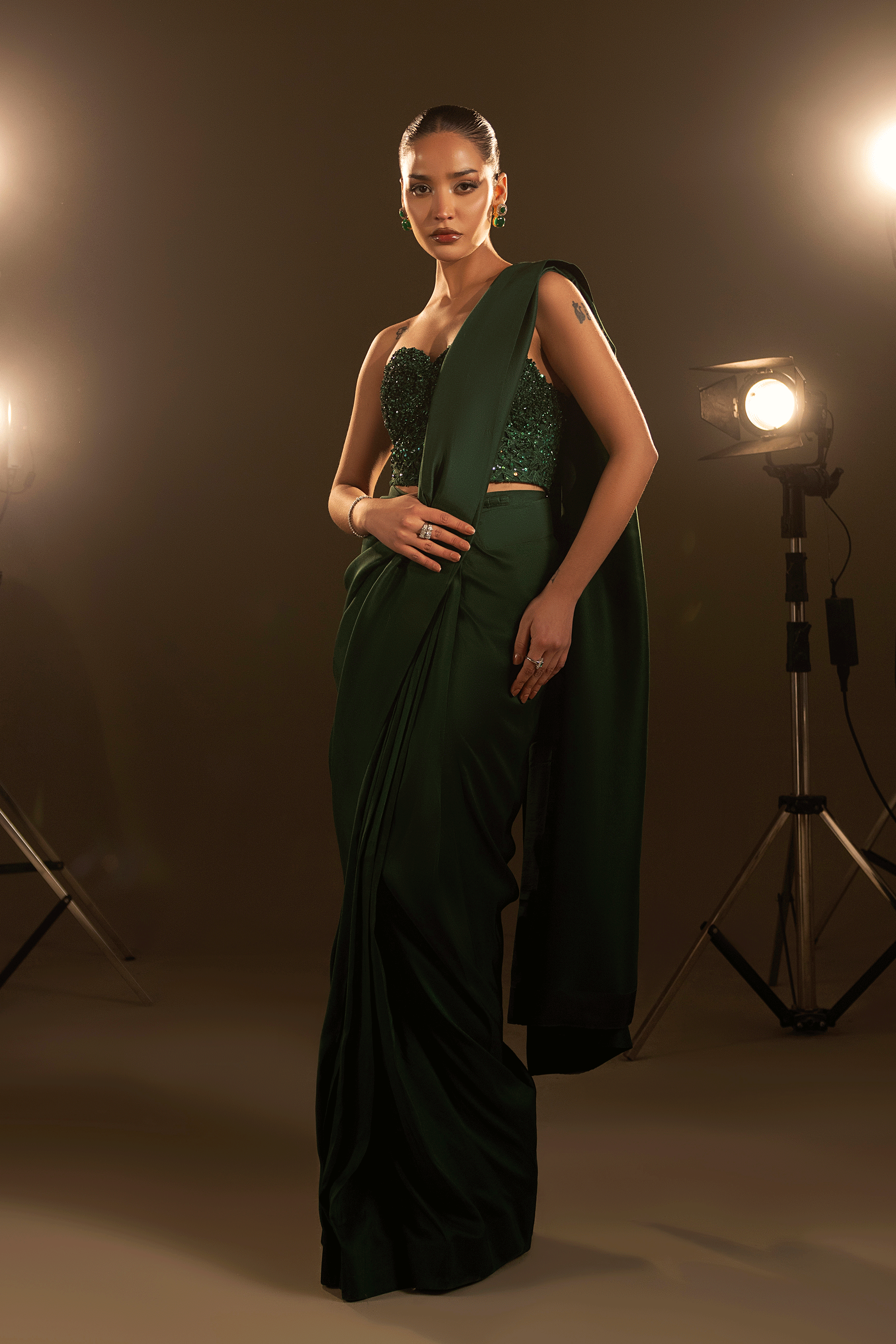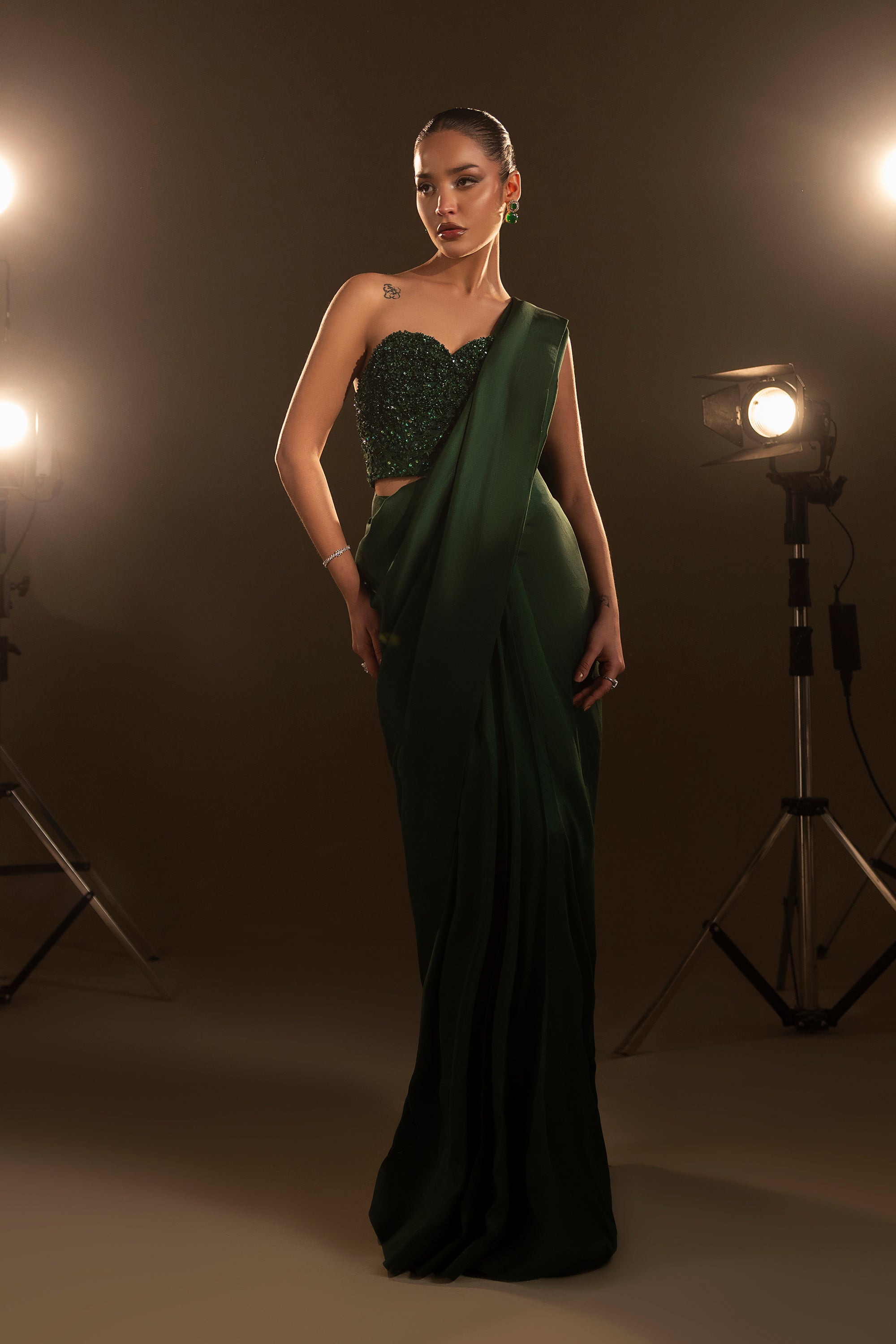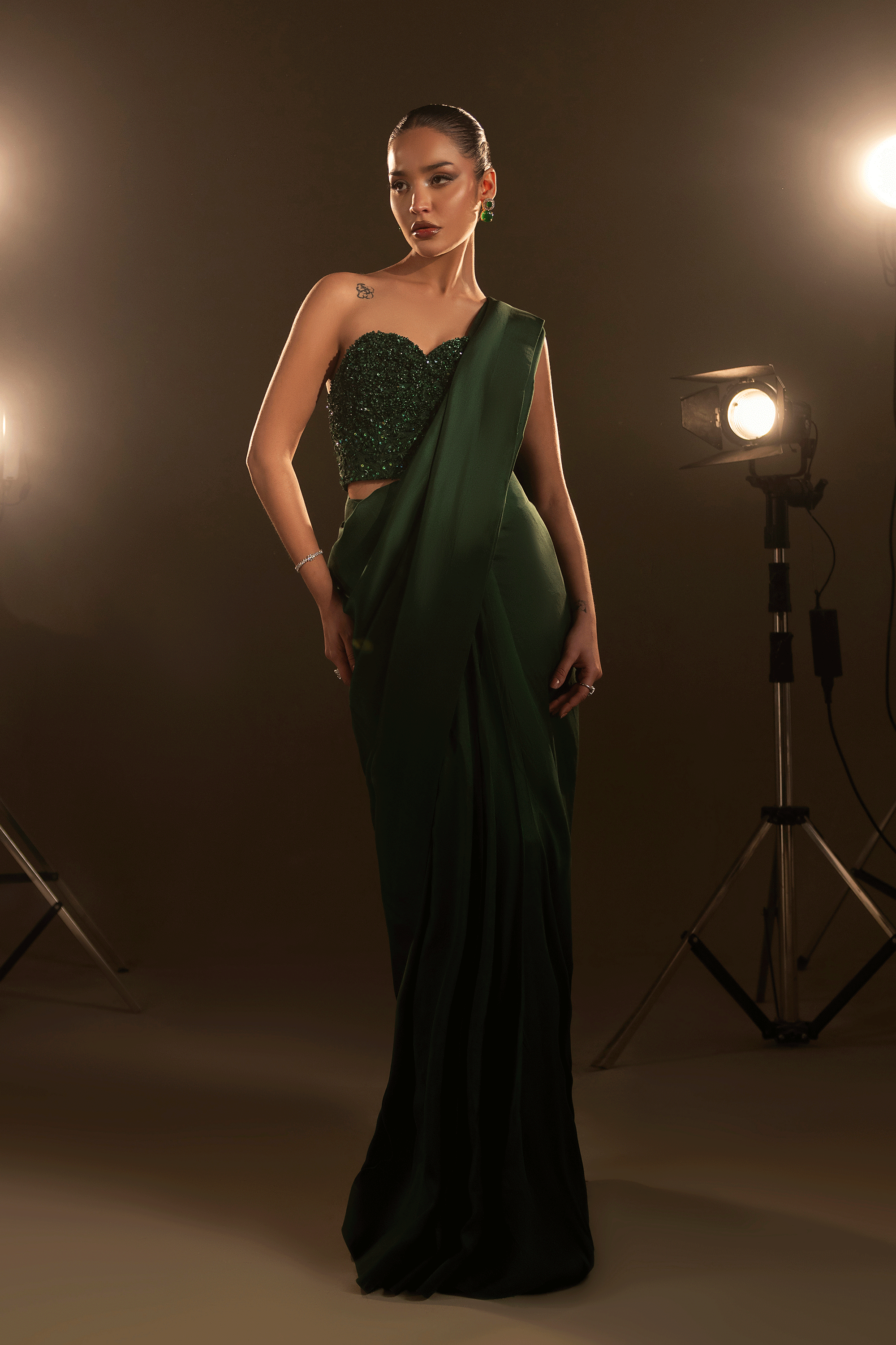 Where sophistication meets allure. This raw silk saree, with its delicate handwork and structured bustier, turns every moment into a main character scene. Effortlessly elegant, undeniably you.