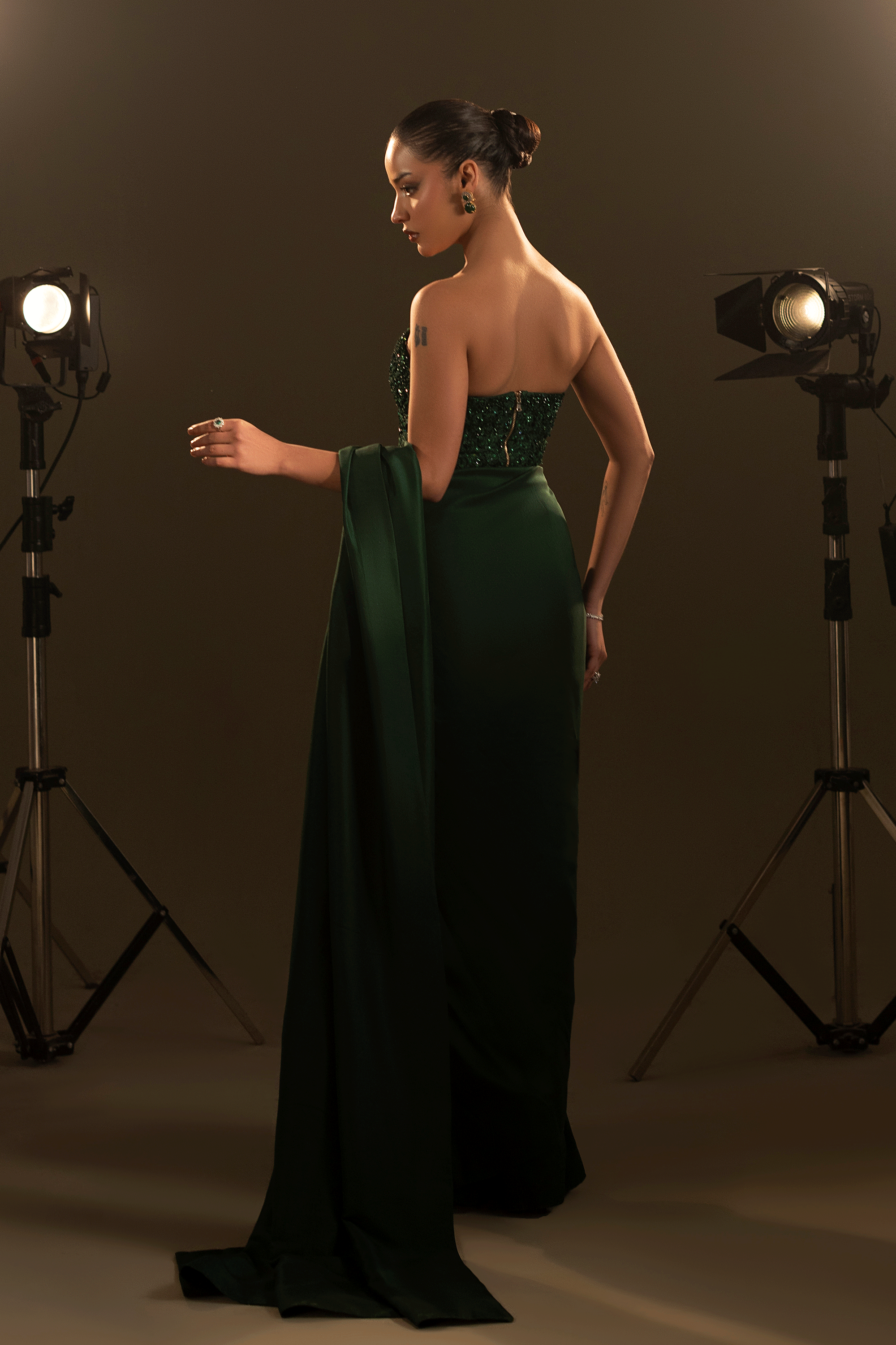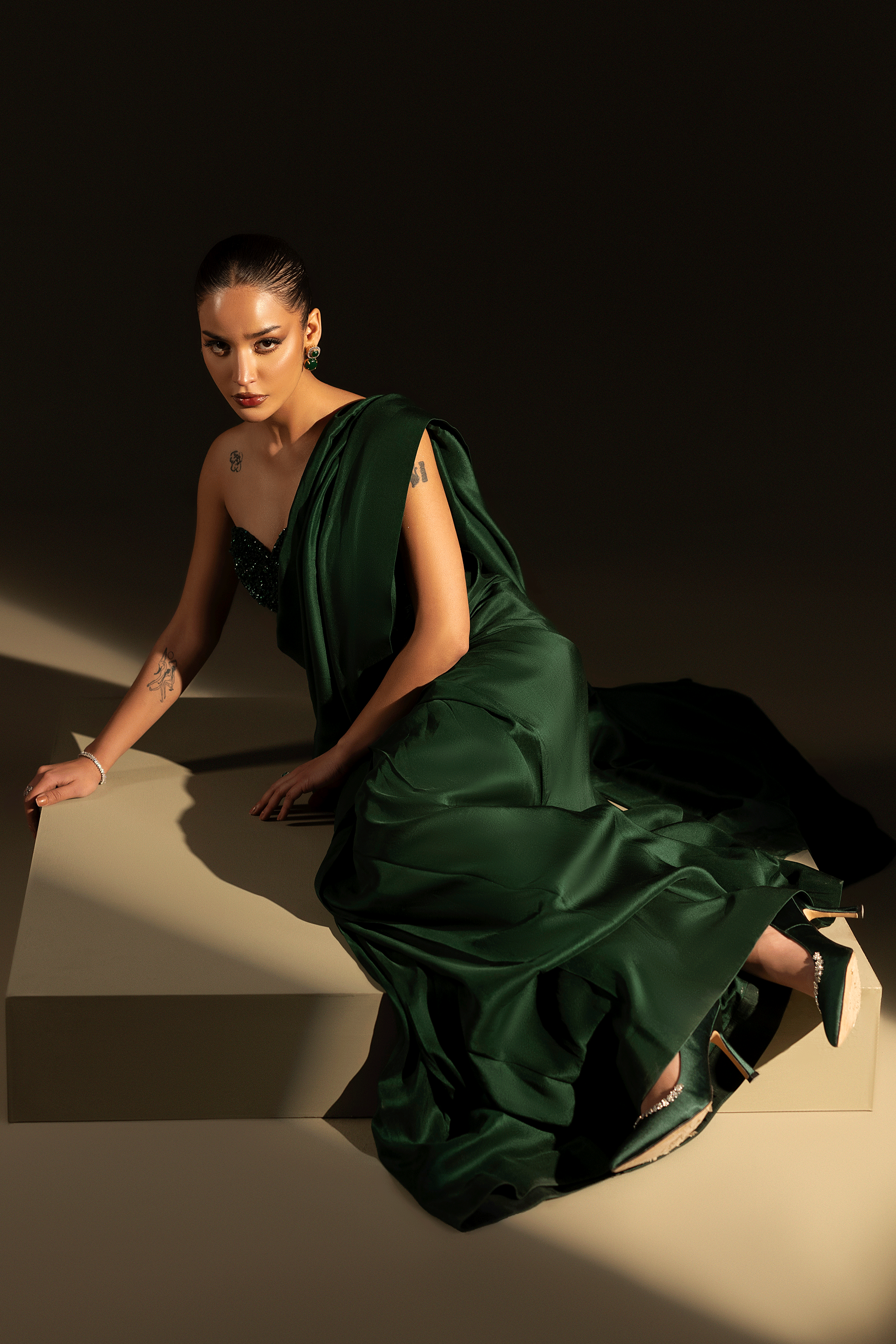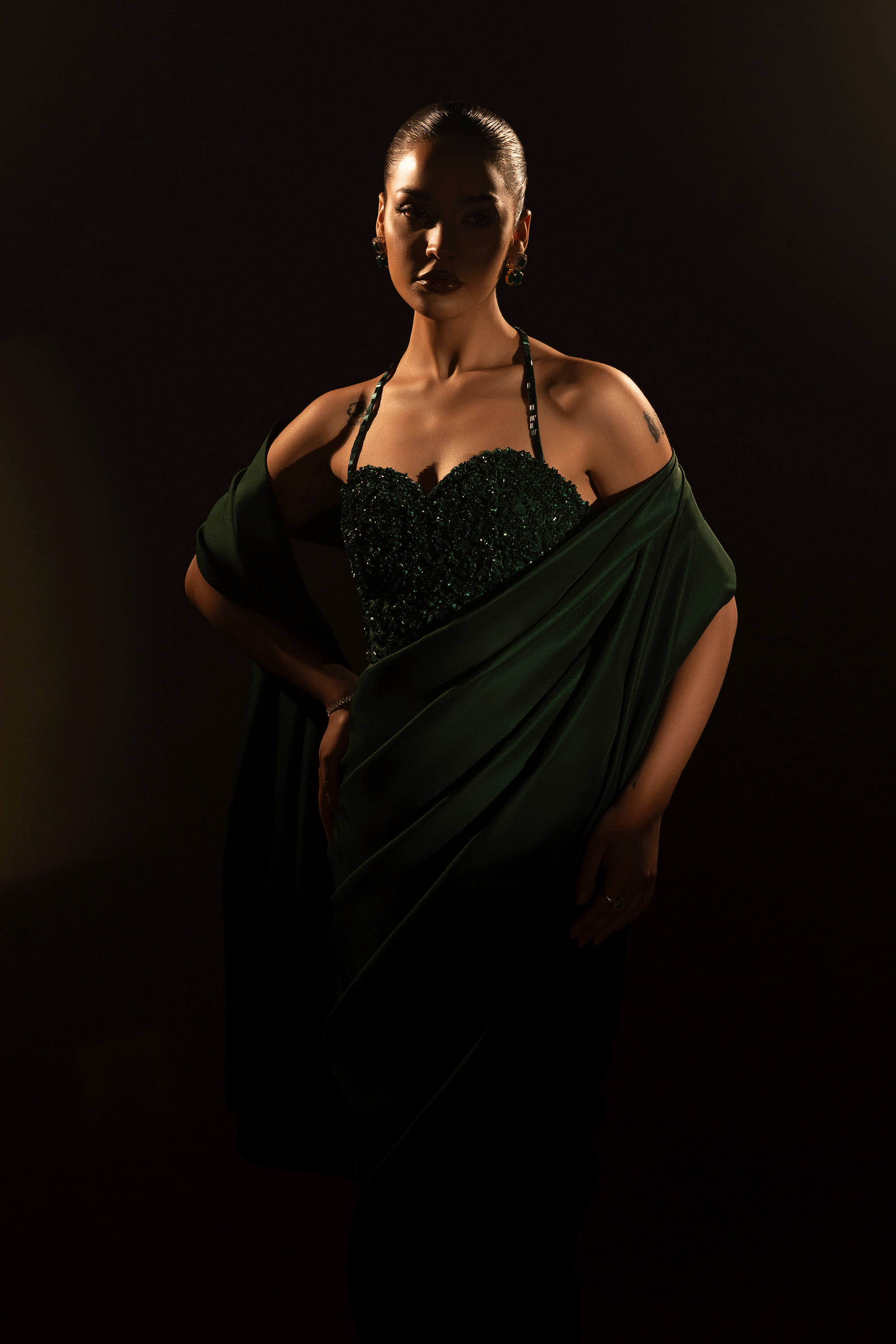 Where sophistication meets allure. This raw silk saree, with its delicate handwork and structured bustier, turns every moment into a main character scene. Effortlessly elegant, undeniably you.