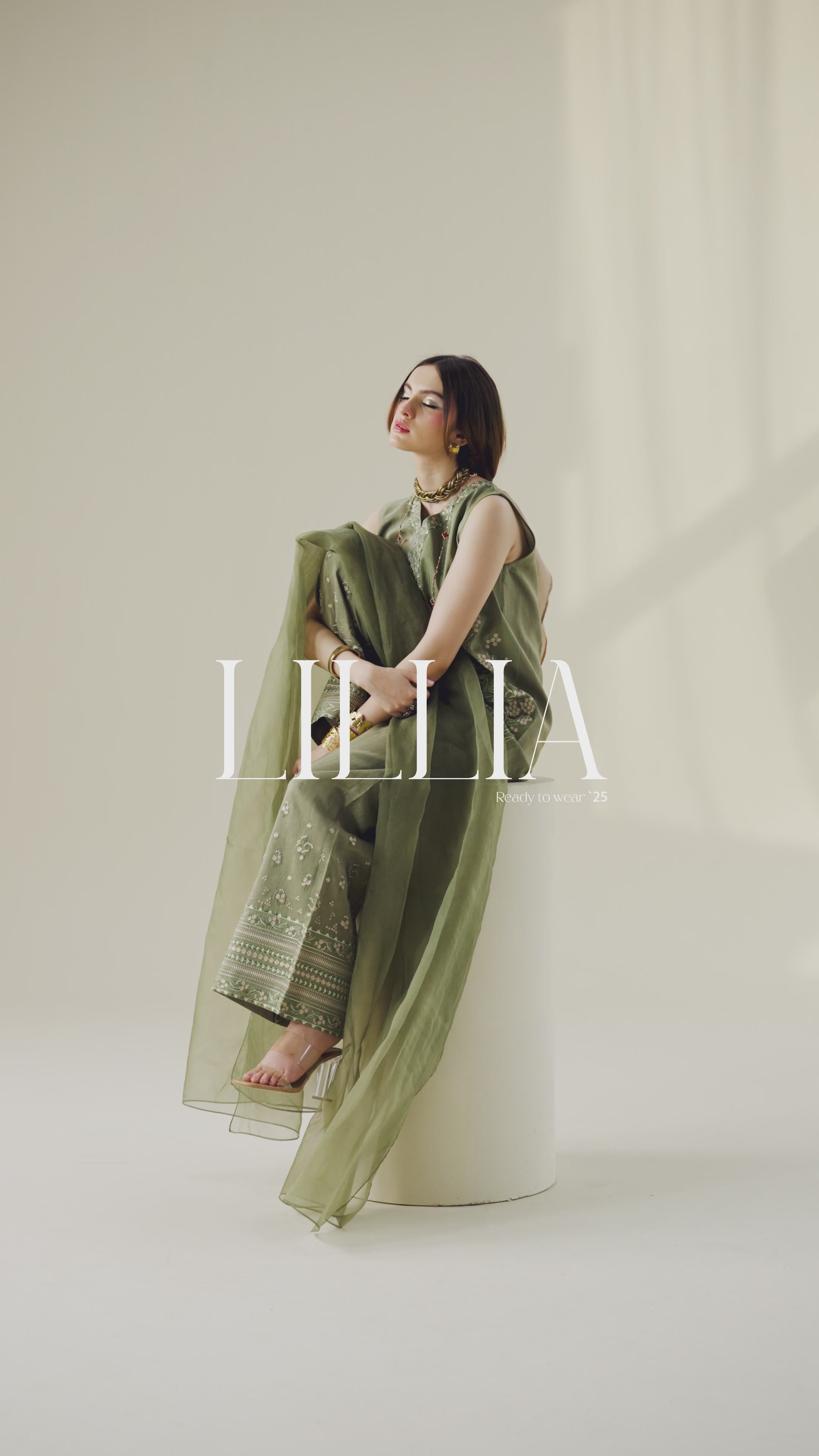 Understated yet effortlessly refined,Olive Bloom captures the essence of modern grace. Featuring a straight-fit short shirt paired with relaxed wide-leg trousers, this ensemble is designed for comfort without compromising on style. The soft organza dupatta adds a touch of lightness and flow, completing the look with subtle elegance.