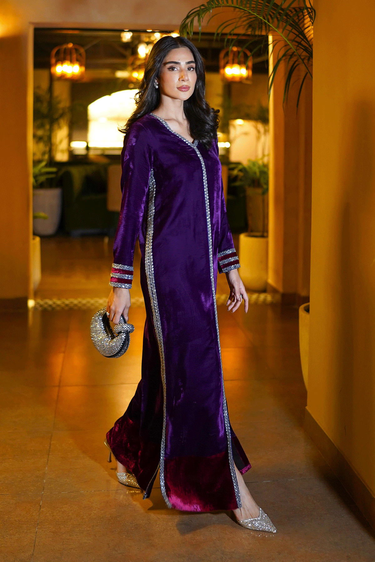 A graceful drop-length, front-open dress exuding elegance with its crystal-beaded neckline and shimmering side trim. The subtle color-block detailing adds a contemporary twist, making it the epitome of luxurious style for your winter soirées.