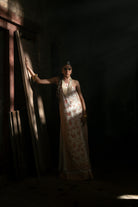 A lengthy crinkle chiffon shirt in pristine white, adorned with intricate Kal patterns and lavishly embroidered borders, featuring a halter neckline that exudes elegance. This exquisite piece is expertly paired with a Pakistani raw silk sharara detailed with borders, complemented by a crinkle chiffon dupatta showcasing elaborate four-sided embroidered borders, adding grace to the ensemble.