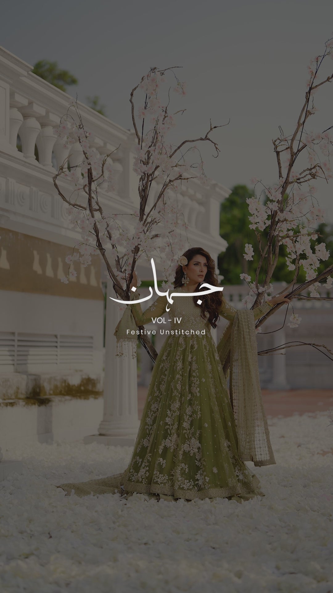 A majestic pistachio green pishwas, resplendently embellished with intricate floral and geometric motifs, exudes an aura of sophistication. The opulent pishwas features lavish embellishments on the front and back, complemented by a stunning organza dupatta adorned with a traditional geometric pattern, channeling timeless elegance and refinement