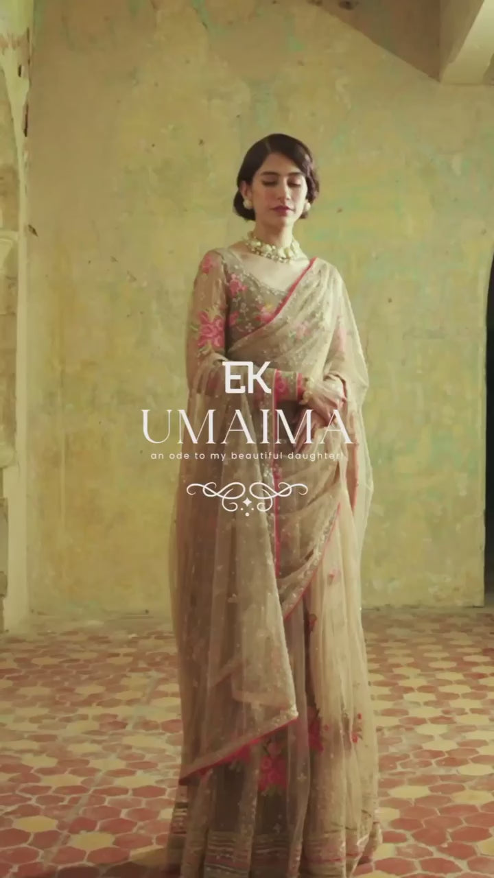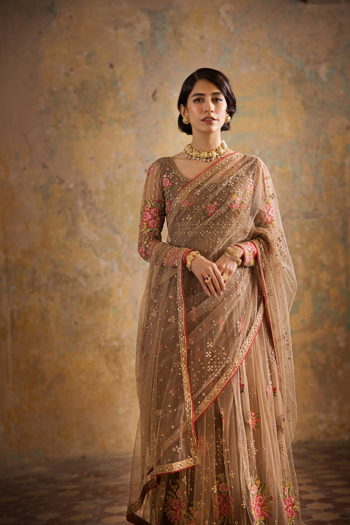 A floral fiesta on an earthy brown-toned fabric is featured in this toe-kissed festive wear. Hints of glistening gold and coral flowers adorn the bodice of the long gown. The look is finished off with a sheer similar-toned dupatta.