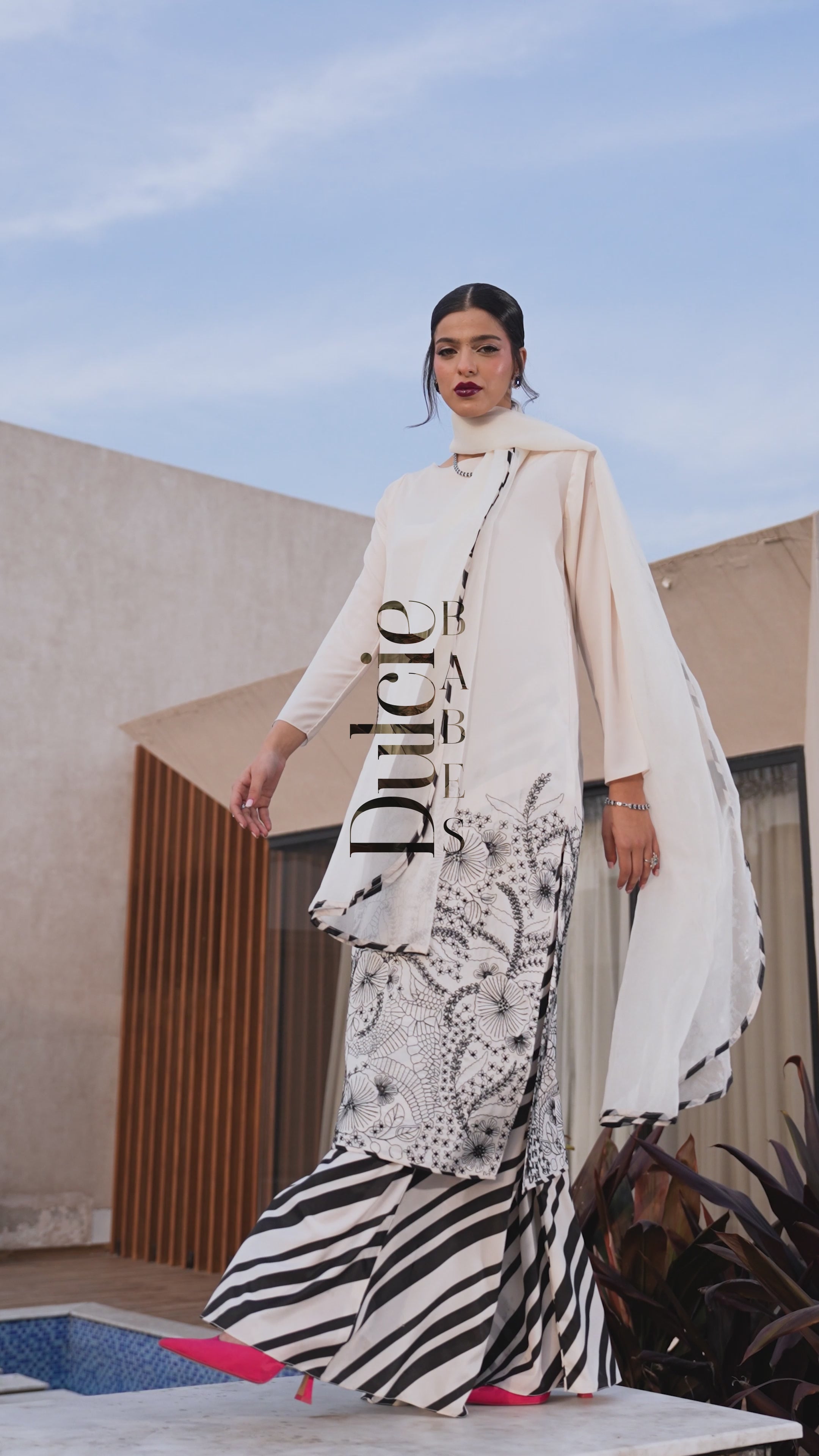 Meet Monochrome Babe -where grip silk sleekness meets stripped flare drama. Topped with a flowy organza dupatta trimmed in black & white, this look is all bout effortless glam with a side of attitude.