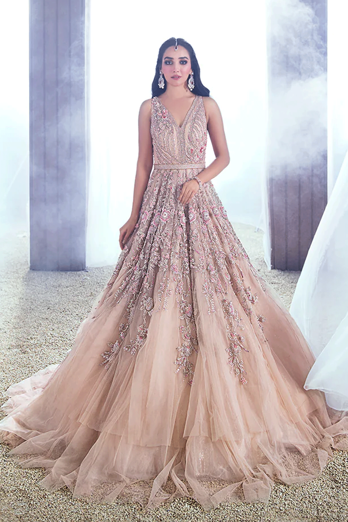 A luxurious bridal maxi in soft, romantic hues, meticulously adorned with sequins, crystals, naqshi, and other finest premium embellishments. Designed to make a statement, this grand ensemble blends delicate charm with regal sophistication, perfect for a bride who desires refined elegance and timeless beauty.