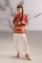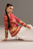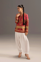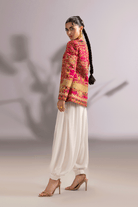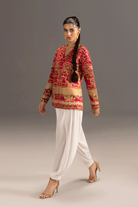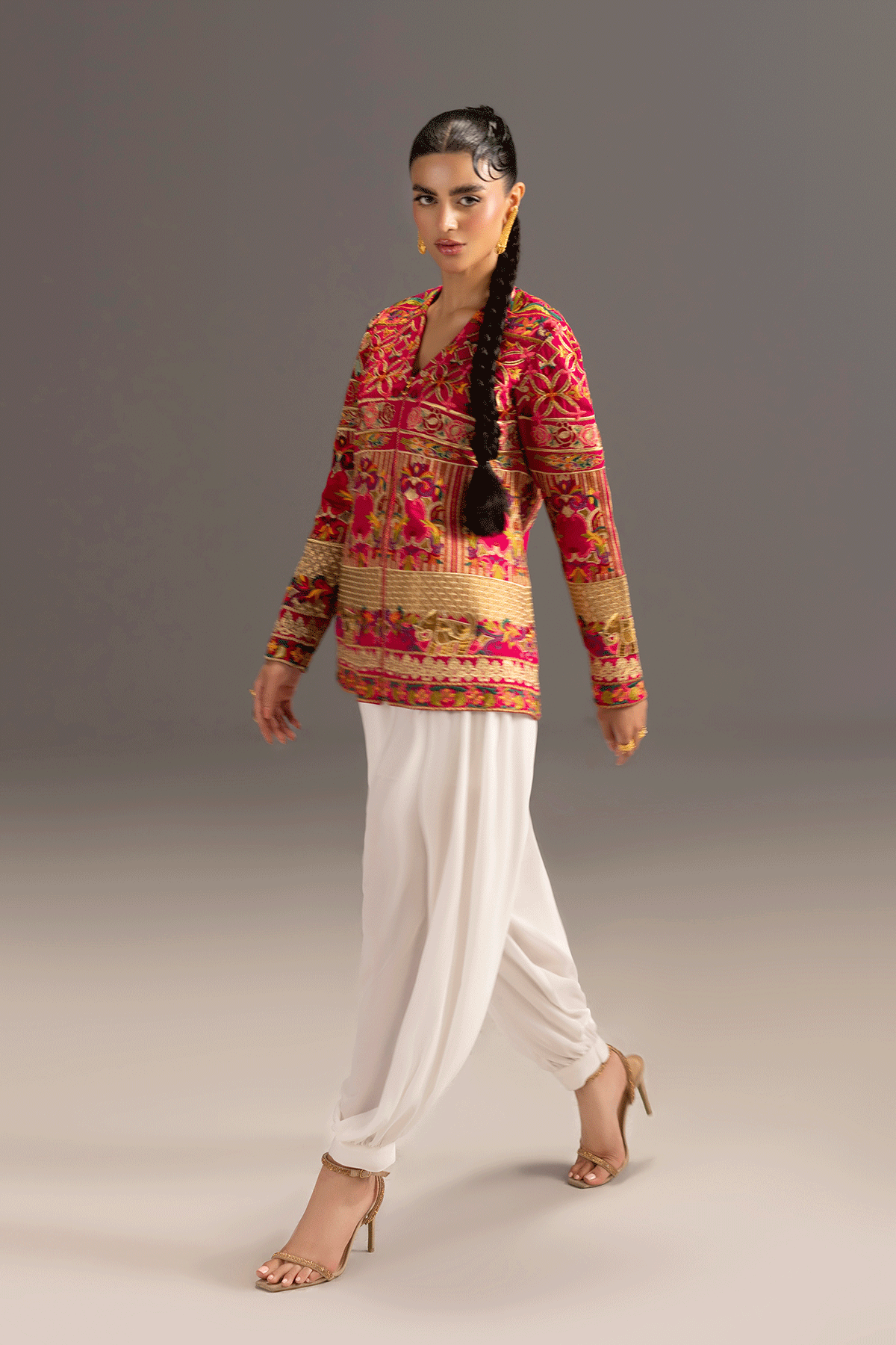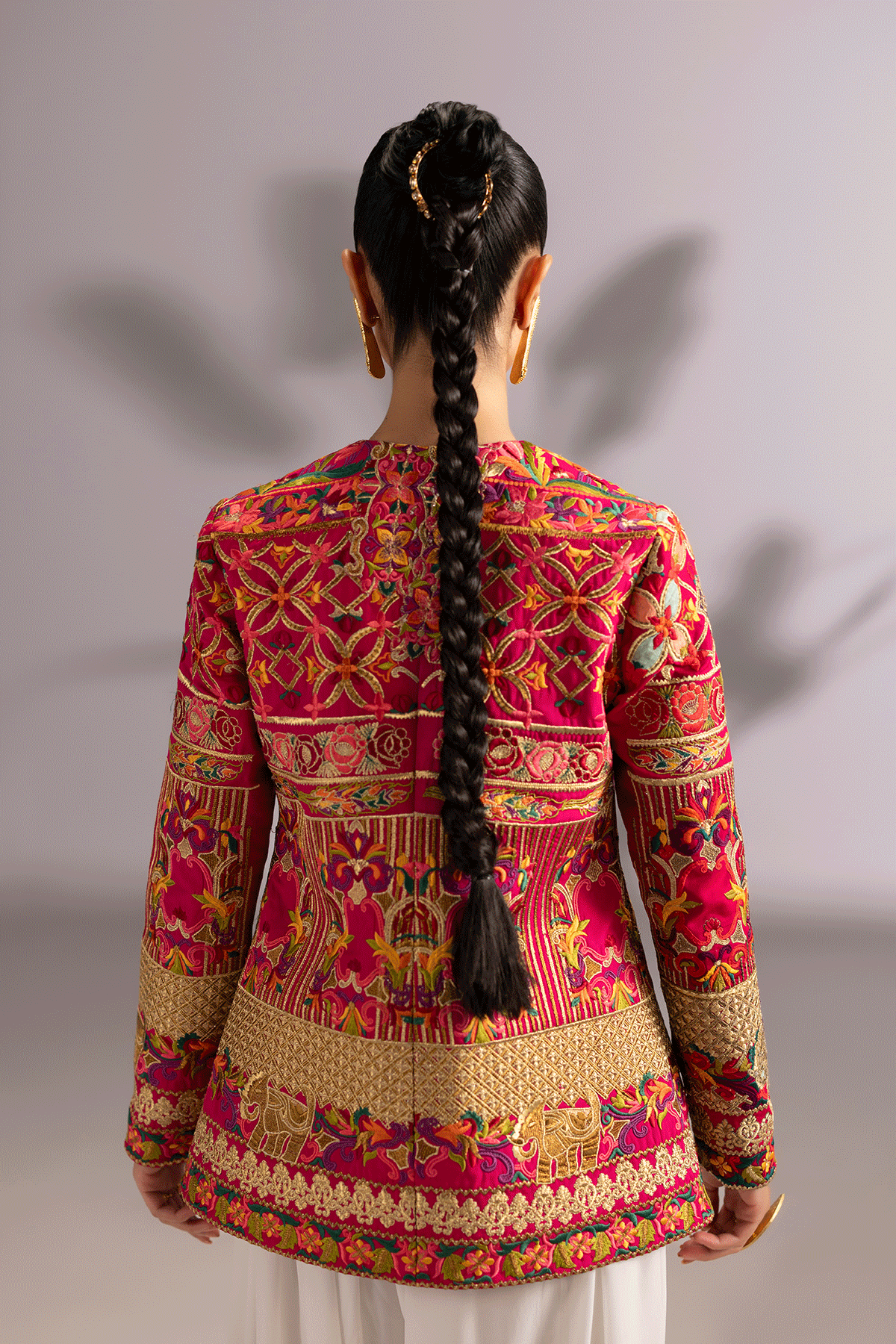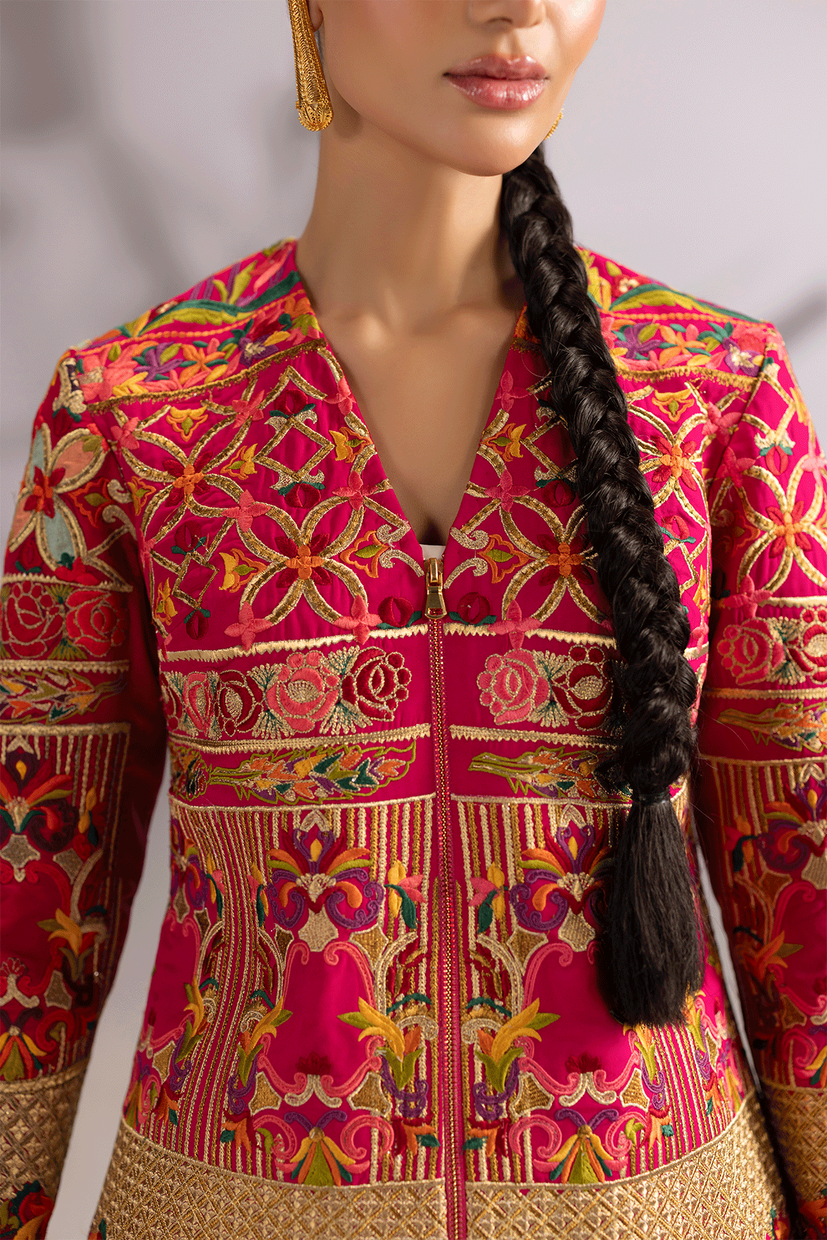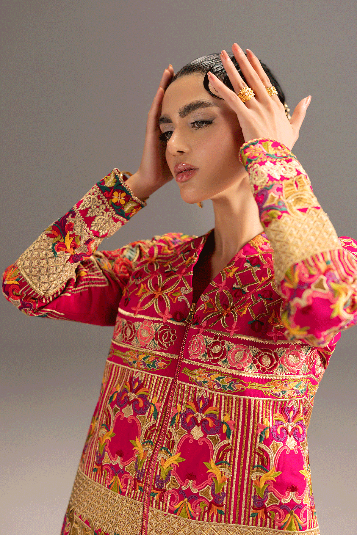 The signature shocking pink two-piece ensemble features a sculpted grip jacket with a gold metallic zip. Intricate Embroidred look is paired with a jacket and ballon pants for a modern, graceful silhouette.