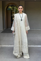 A timeless ensemble featuring a long shirt crafted from delicate organza, paired with raw silk trousers for a luxurious finish. The outfit is beautifully adorned with ivory silk thread embroidery, enhanced by subtle accents of gold tila and hand-sewn sequins, adding a graceful shimmer to its ethereal charm. Perfect for festive occasions and formal gatherings, this piece embodies sophistication.