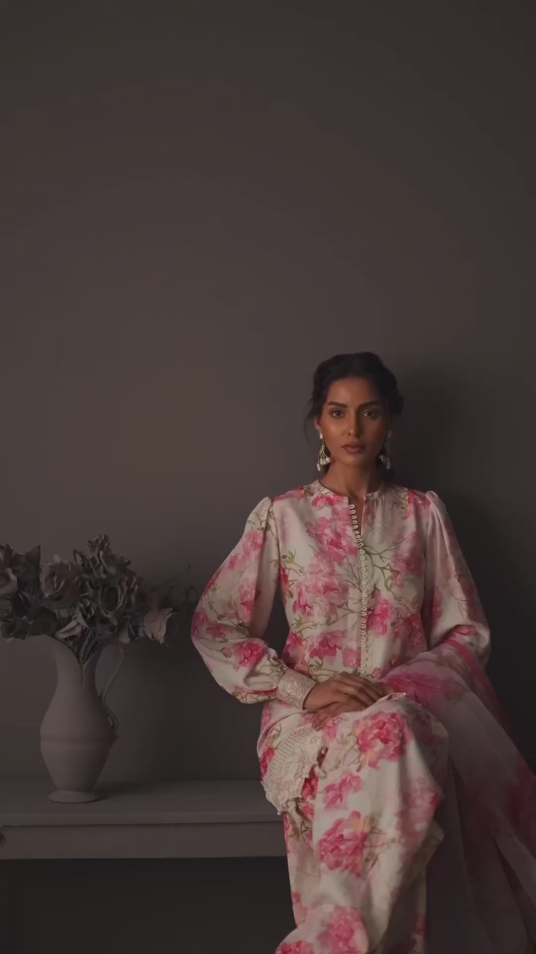 This captivating design features a charming short shirt. The shirt is enhanced with loops and a slit at the front, detailed with puffed sleeves and subtle plain embroidery along the daman for a touch of sophistication. The outfit is paired with a flowy shalwar, adding a unique and refined element. Complementing the ensemble is a stunning dupatta, in a pink floral print, that drapes gracefully and completes the look with its intricate design.