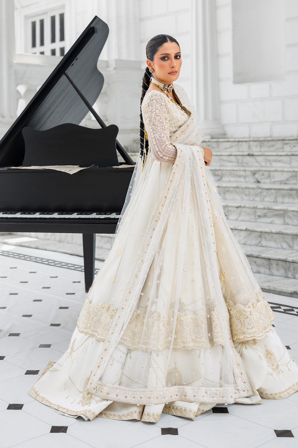 The outfit is a stunning white pishwas paired with a matching embroidered lehenga. The Lehnga is adorned with delicate gold thread work, adding a touch of luxury and sophistication, creating a cohesive and harmonious look. The white and gold color combination gives the outfit a regal and elegant appearance, perfect for formal events.