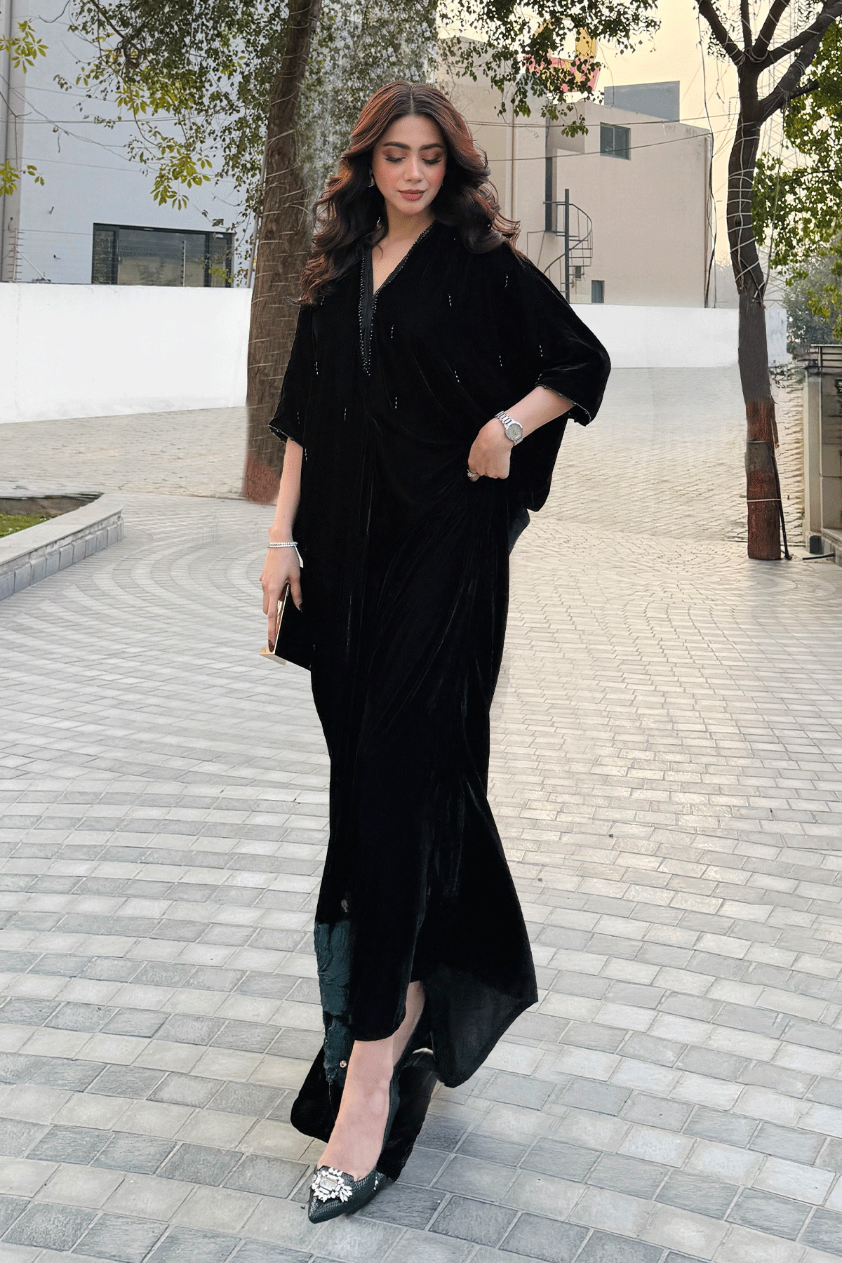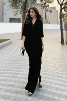 A statement velvet kaftan in classic black, elevated with intricate detailing along the borders for a refined finish. Designed in a fluid, relaxed silhouette, the rich velvet drapes effortlessly, offering both comfort and sophistication. The subtle border embellishments add depth and definition, making this kaftan an ideal choice for evening gatherings and festive occasions.