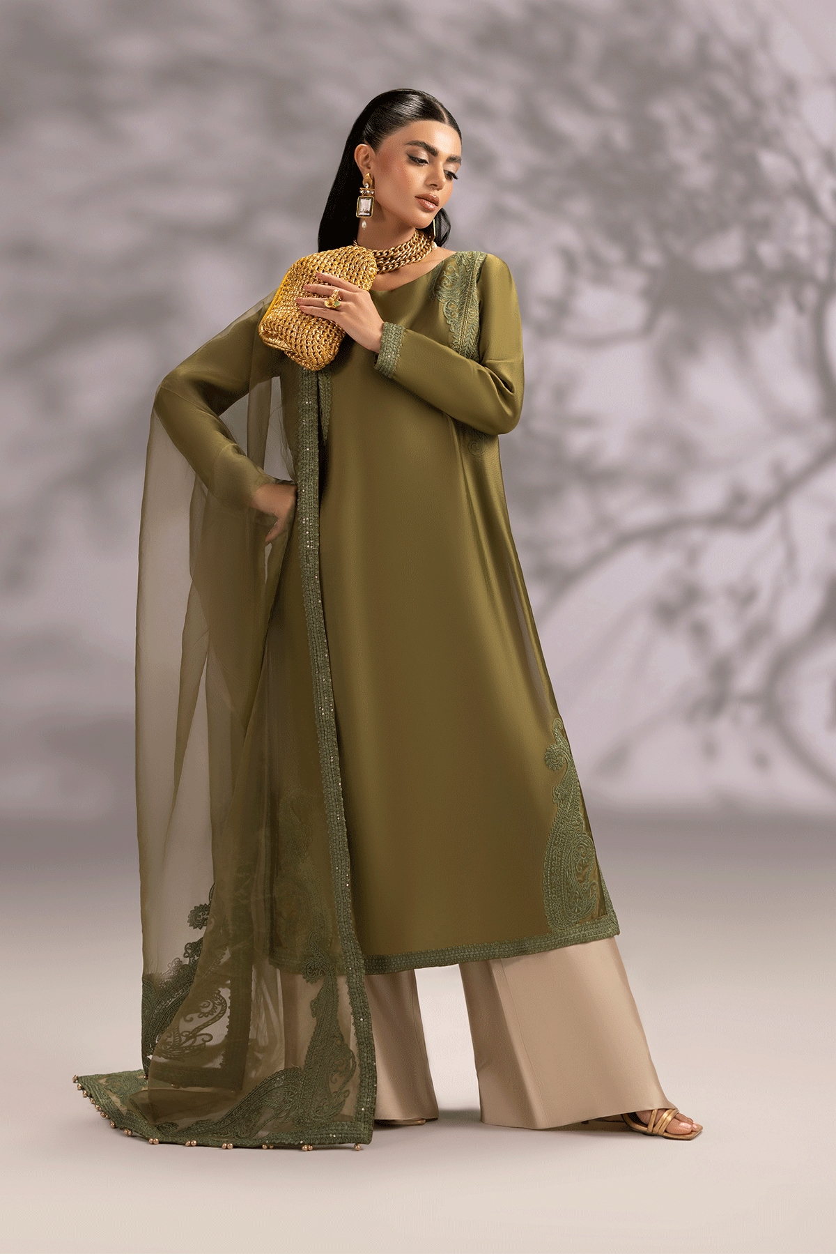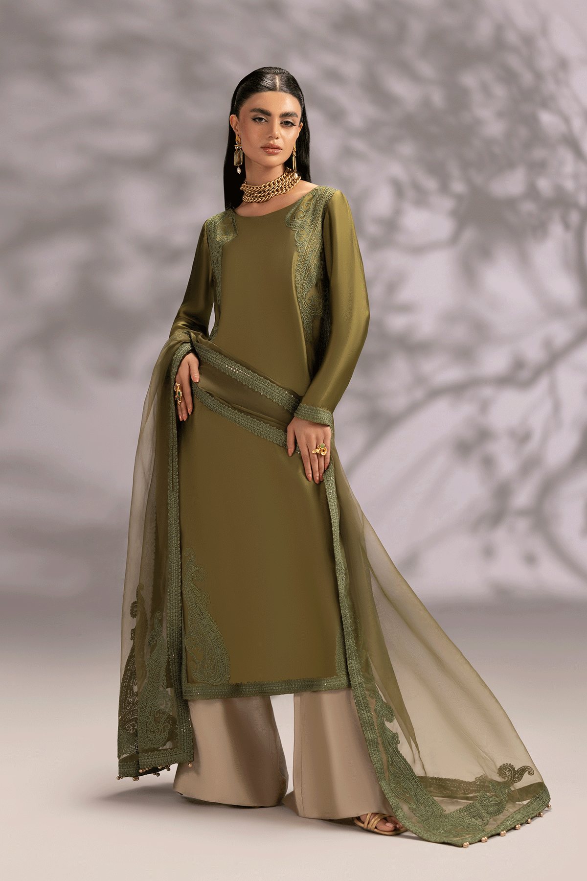 A stunning three-piece embroidered ensemble, meticulously crafted with intricate detailing and sophisticated design. The outfit features a long  shirt adorned with exquisite paisley embroidery in shades of  green. The delicate patterns accentuate the round slit neckline, shirt corners and dupatta. The ensemble is paired with a beautifully embroidered organza dupatta, adorned with subtle tassel detailing along the edges