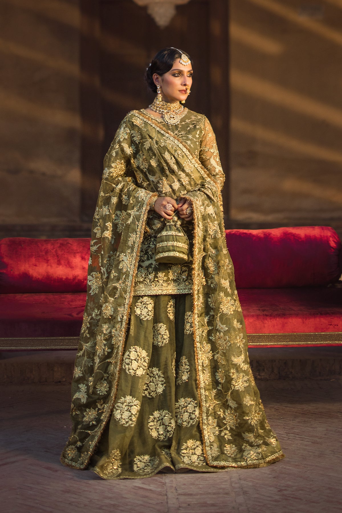 An enchanting ensemble that captures the sophistication of premium vintage fashion. The centerpiece is a mehndi green organza short shirt, adorned with intricate jali embroidery patterns and delicate gota hand embellishments. Paired seamlessly with a matching mehndi green organza sharara, embellished with exquisite boti work, this ensemble radiates graceful charm and vintage allure. Completing the look is a mehndi green organza dupatta, featuring beautifully embroidered jali patterns inspired by royal vintage aesthetics, and accentuated with a four-sided kiran border. This touch of regal opulence infuses the ensemble with understated grandeur, making it a perfect blend of historical elegance and modern sophistication.