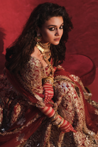 Behold the resplendent beauty of this exquisite red and gold toe-kissed traditional gown. Crafted with meticulous artistry, the rich red fabric shimmers with a golden undertone, capturing the essence of regality.