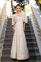 Featuring a structured corset seamlessly paired with a flowing skirt, this design is adorned with dreamy monochromatic embellishments—lustrous pearls, glimmering crystals, shimmering sequins, and meticulously hand-cut pipes. Crafted from the finest tulle, this ethereal ensemble is truly a visual masterpiece, radiating sophistication. Completing the look is a heavily embellished bolero, adding a touch of poise and grandeur to this captivating creation.